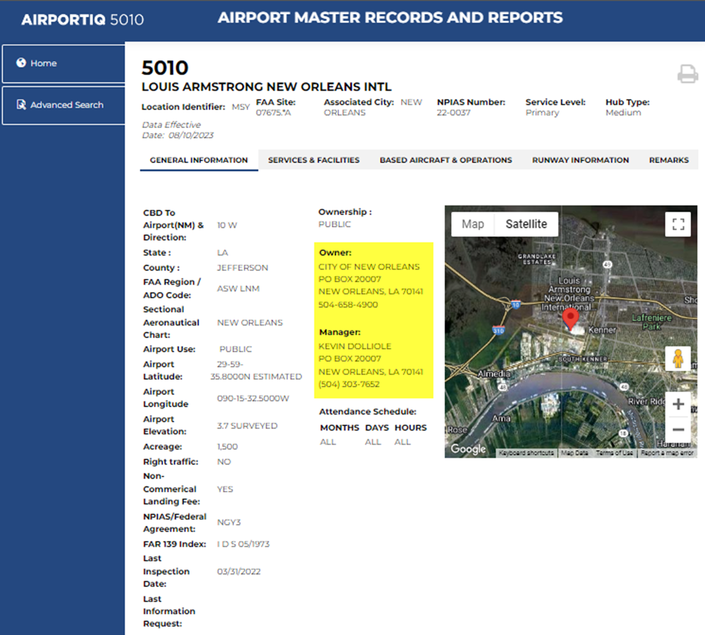 To verify the airport owner / manager listed on Form 5010-1, please visit AirportIQ 5010.