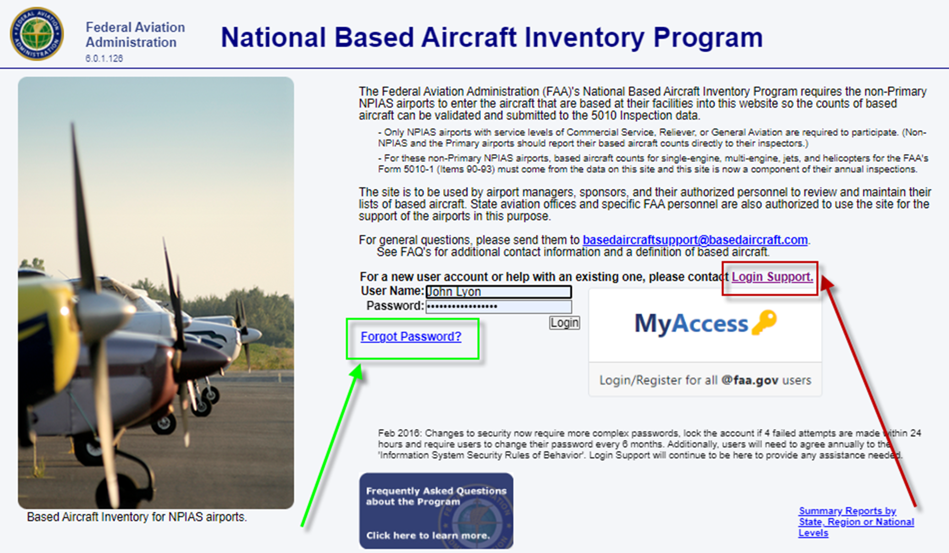 FAA Region and State Aviation Office staff can also obtain a login that allows them to review airport lists and edit aircraft lists of individual airports within their jurisdictions. Eligibility for FAA Region and State Aviation accounts will be reviewed and approved by the FAA Planning Division, so may take additional time to be created.