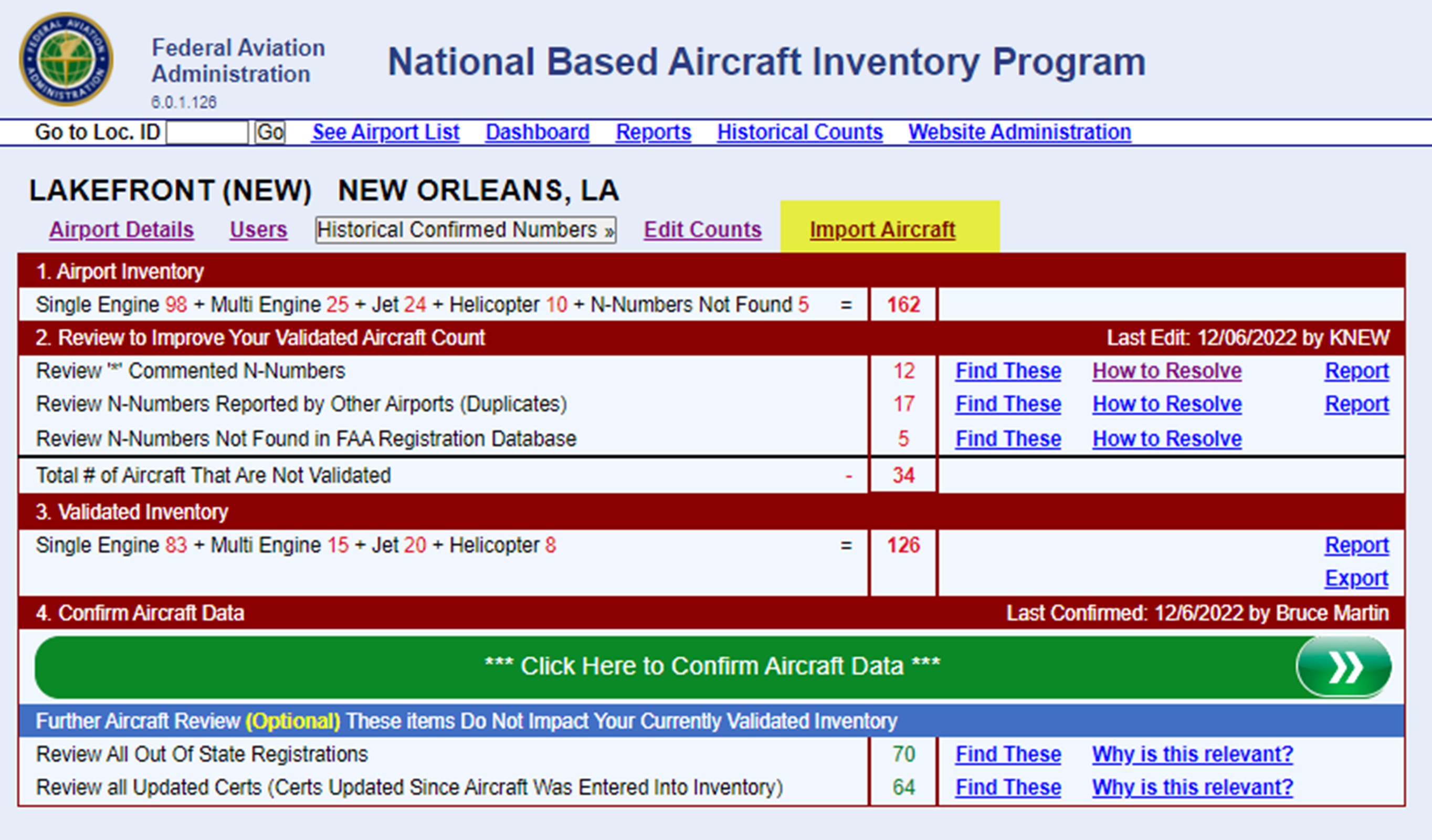 If you do not confirm and save your aircraft data, your updated validated aircraft totals will not be updated to the Airport Master Record (FAA Form 5010-1) and will not be used in airport planning. Based aircraft counts are one of the criteria used to determine eligibility for inclusion in the NPIAS, which is a requirement to receive Federal funds. Inaccurate counts can negatively impact proper planning and may cause improper sizing of key capital improvement projects at airports.